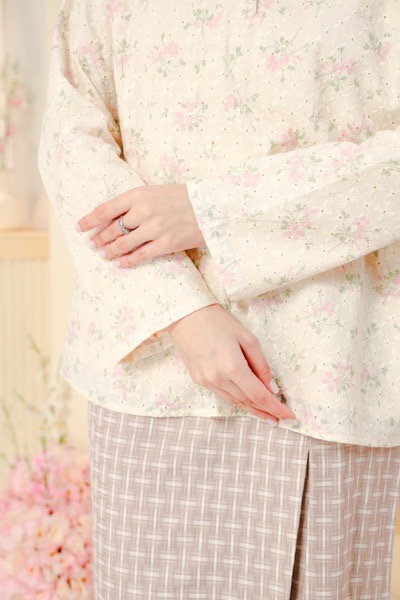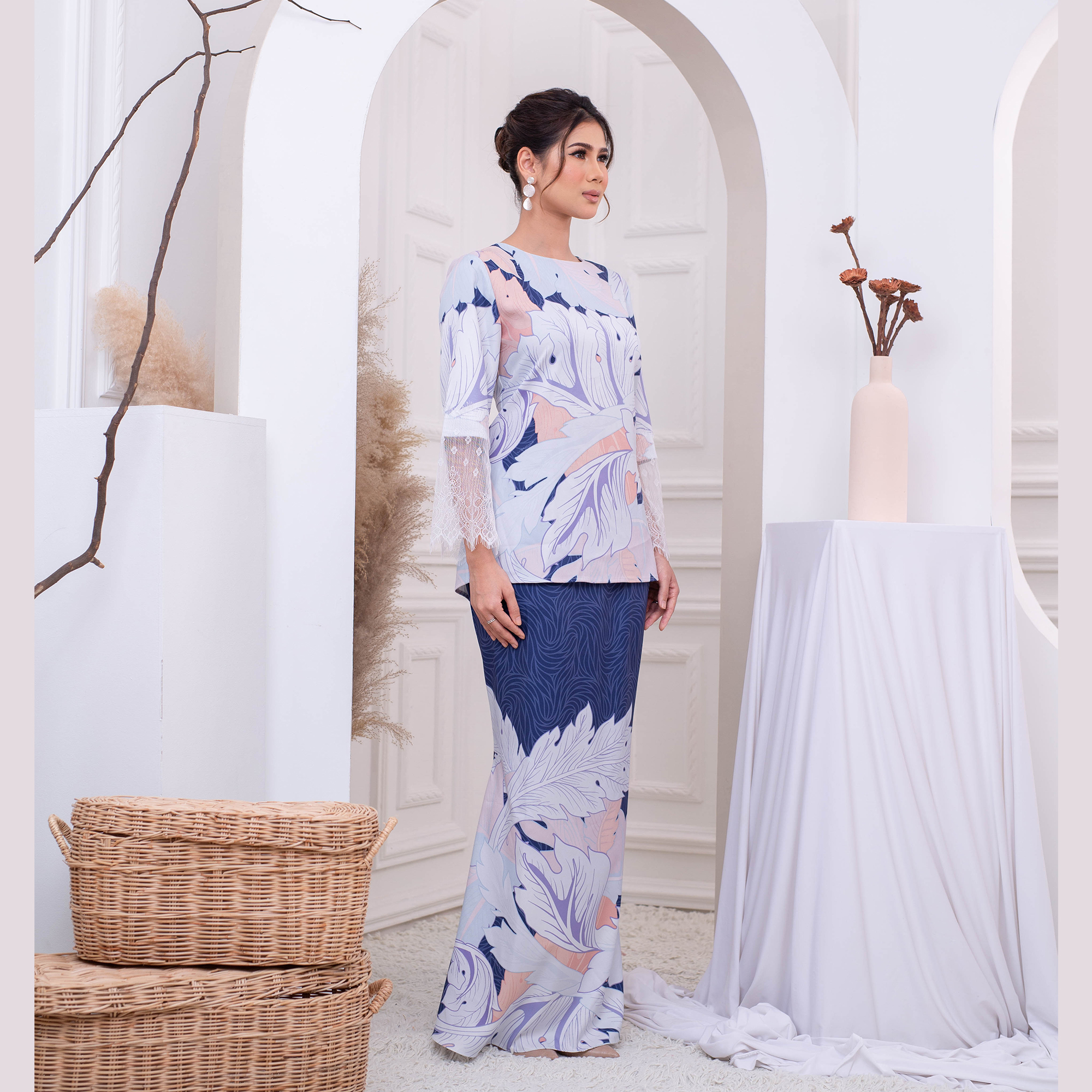 A modern mini kurung in the customized element of nature motif, added with lace sleeves for a romantic mood. A laidback looks with a timeless feels is our story.
